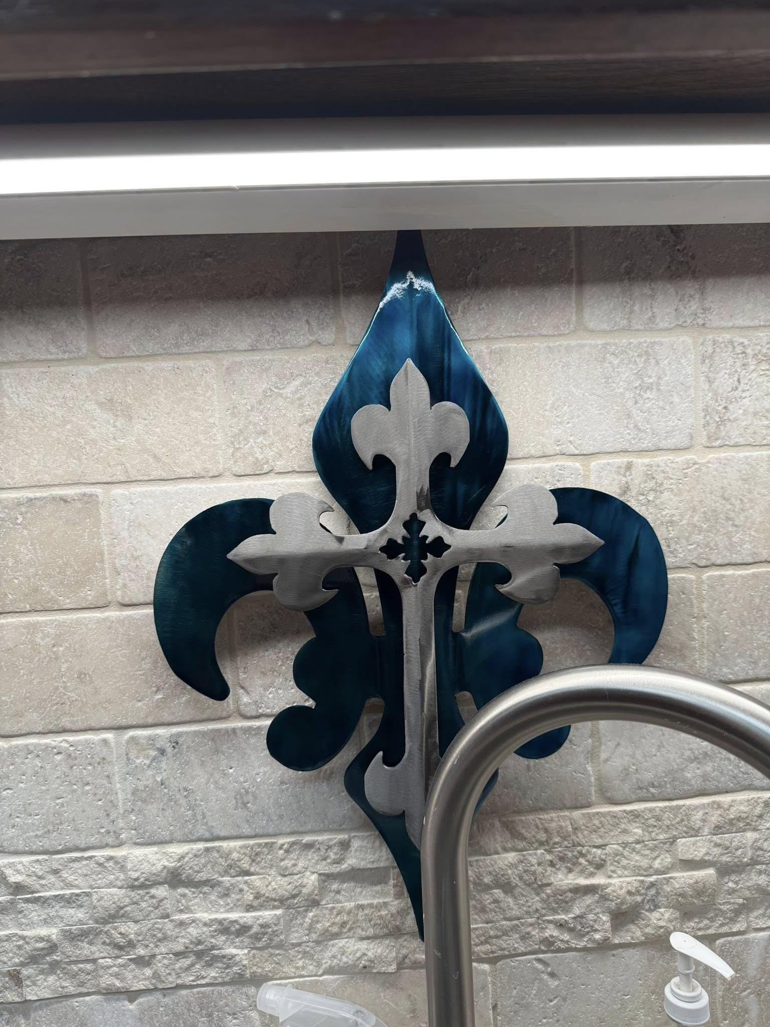This 2-part Cross Fleur De Lis is done in a beautiful Blue Fleur De Lis and a Polished Cross with a clear powder coat finish.